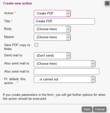 When editing a form you may specify that any answer should be saved as a PDF. This will happen regardless of form actions.