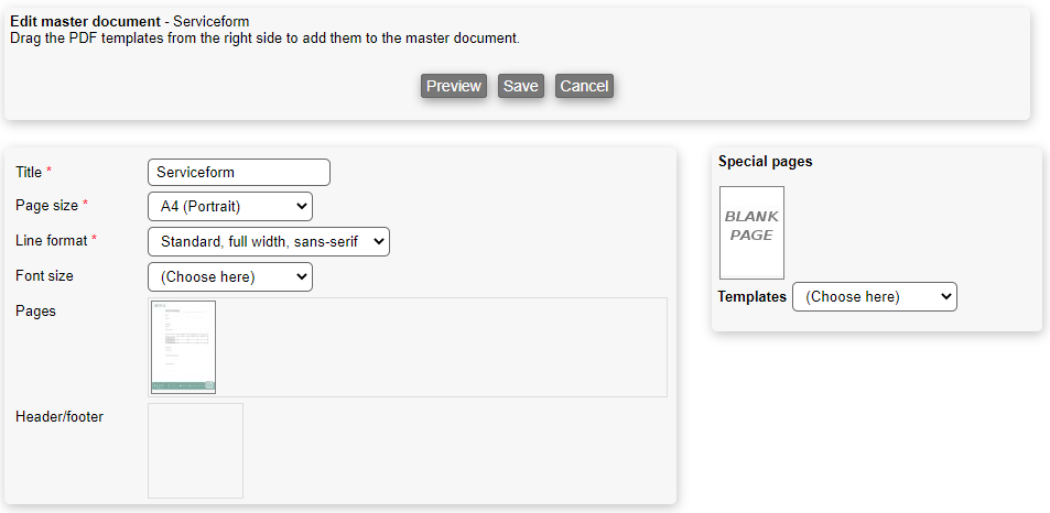 On the right side you can select a module from where to take the PDF templates; this will then list the PDF templates available for that module. Above those is a list of "special pages", which includes an empty page. Notice that all PDFs that are used for a master must have the same size in millimeters.