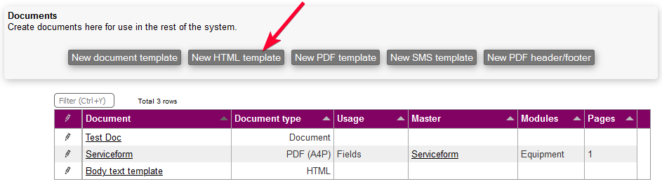 Here you can create HTML templates for yourmasters. To do so, click on the "New HTML template"-button as shown below.