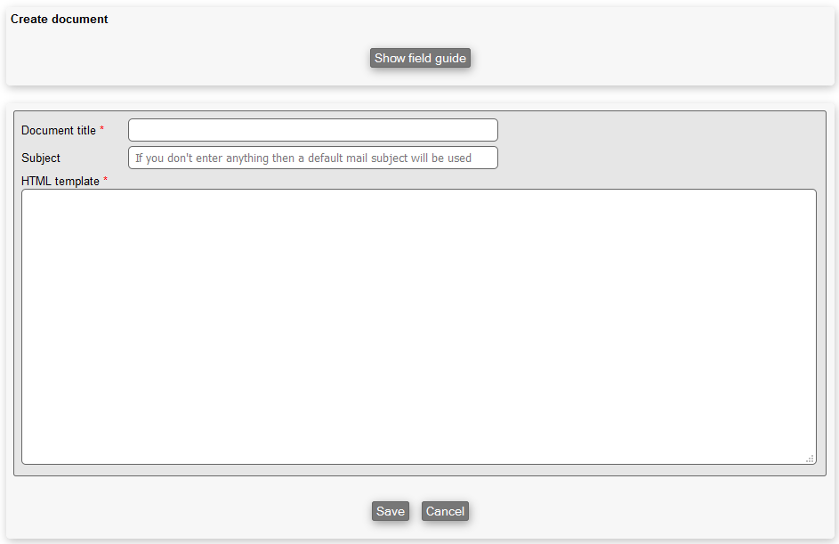 HTML template: The content for the template in HTML code. Furthermore, you can insert code which gets information from across your Microbizz system. For a list of codes, press the "Show field guide"-button