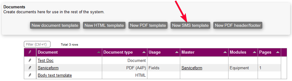 Here you can create SMS templates for yourmasters. To do so, click on the "New SMS template"-button as shown below.
