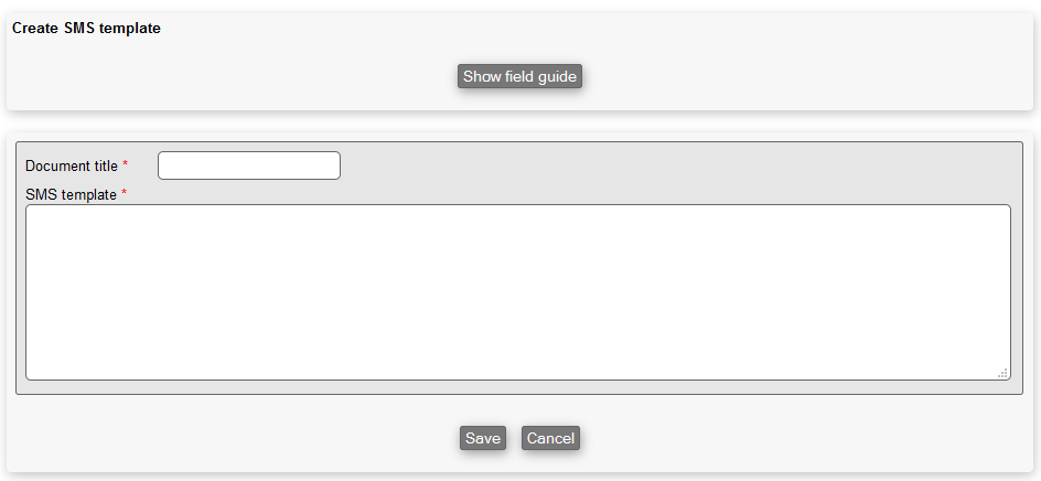 SMS template: The content for the template. Furthermore, you can insert code which gets information from across your Microbizz system. For a list of codes, press the "Show field guide"-button