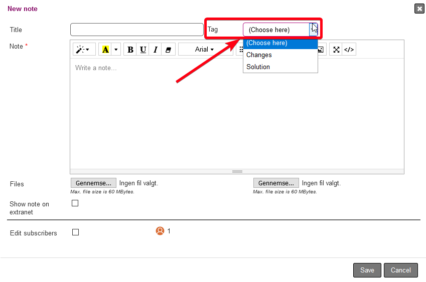 When writing a note on an object (e.g. a task), you can choose the tag as such: