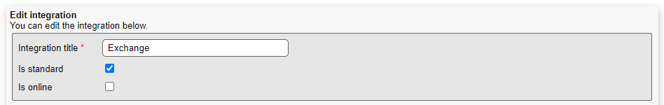- Is standard: If this is checked (and you have several integrations), this integration will be chosen as default, when you create new objects (CRM objects, tasks etc.) that this integration can handle.
