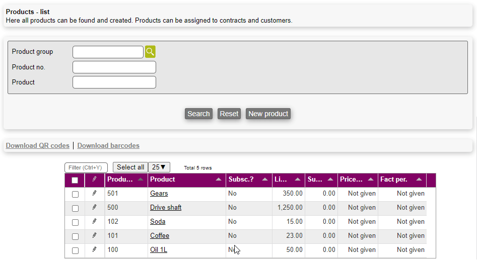 As with many other modules in Microbizz you can search for the specific objects within the module - in this case product objects.