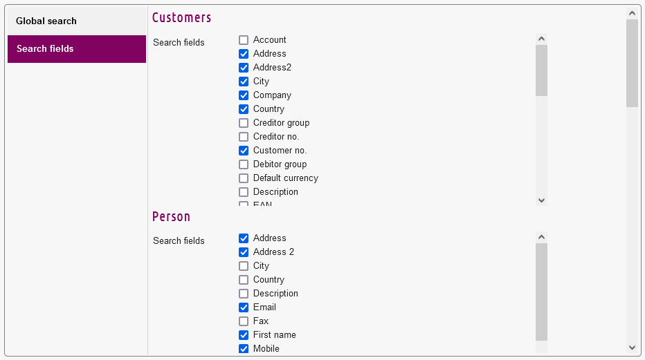 In this menu, you can choose which fields you can search for, thus customizing the results of the global search.