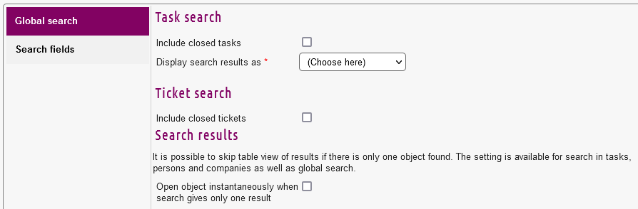 Open object instantaneously when search gives only one result: If marked, when searching for objects in the Tasks, Person and CRM modules, as well as the global search, the table view is skipped. You are taken directly to the object