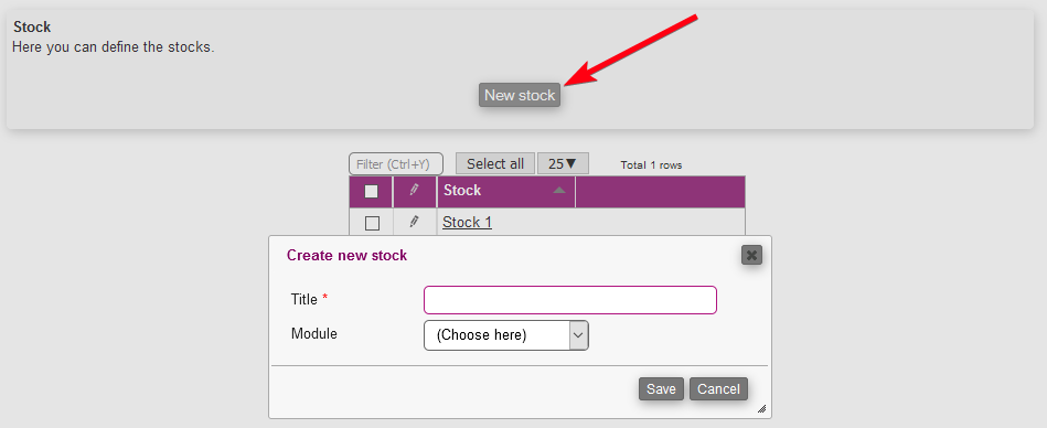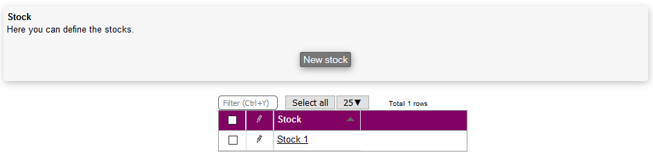 Creating and editing stock is done nearly as everything else. To create a new stock, press the New stock button: