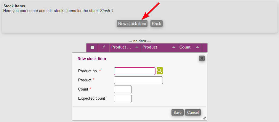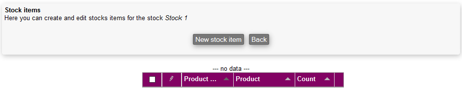 To create a new stock item, press the New stock item button. Press Back to go back to the stock page.