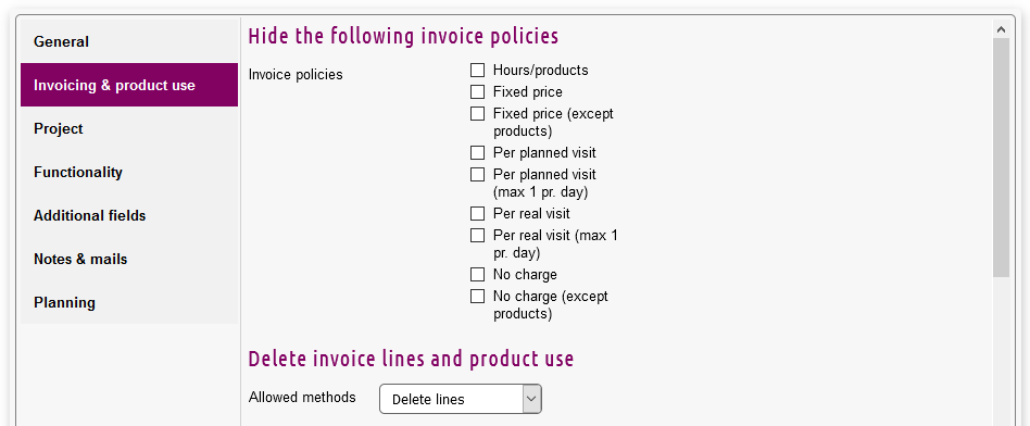 - Invoice policies: Check off any policy that you wish to hide