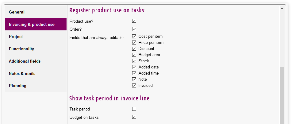 - Task period: If checked, the period for fixed priced tasks is included in the invoiceline for the fixed price