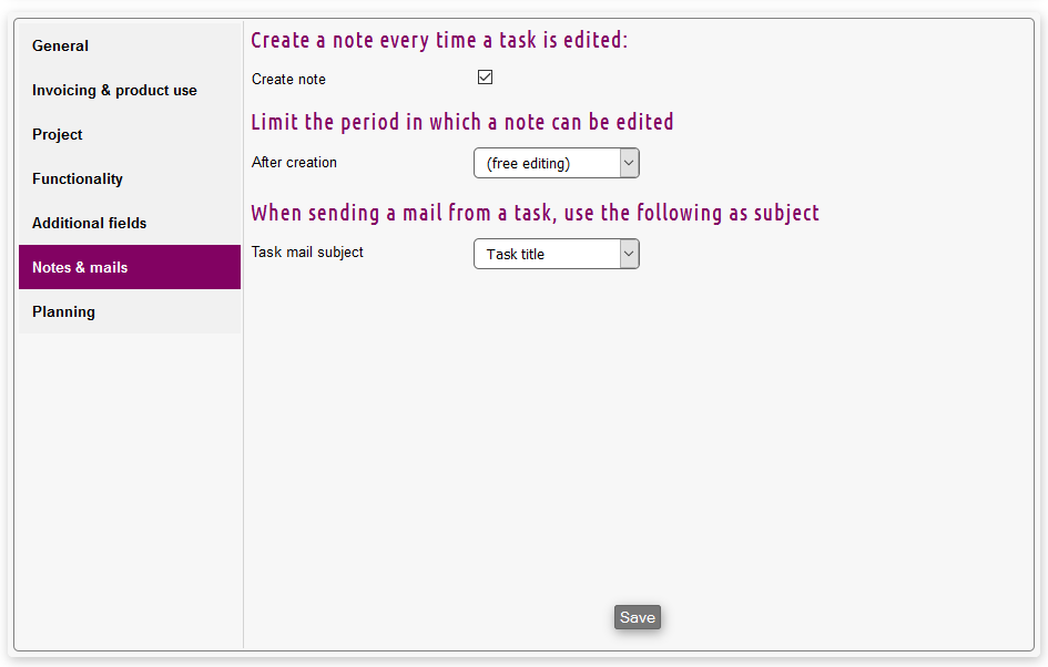 Use contact person: If checked, every task has a contact person (from the Person module); if not checked the task will simply have fields for entering the name and phone of a person.