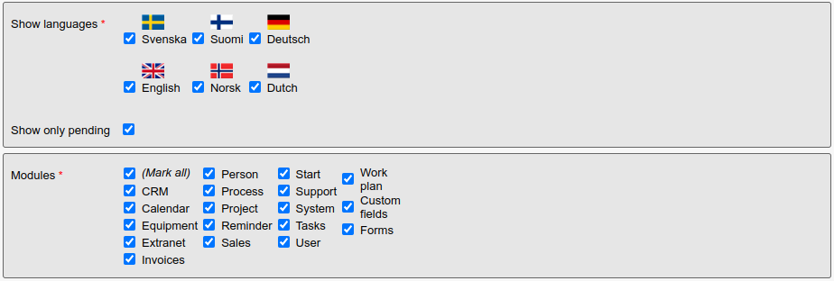 Here you can translate question forms, task statuses, SLAs, customer types, extranet pages, project types and more from the base language to any of the other enabled languages.