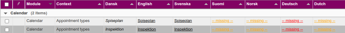 If a translation is missing/empty this will be shown as "–missing–" in orange or red. Red means that the base language text may have changed, so the text should be updated.