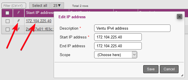 Editing an IP address happens on the same menu. Just click on the pencil or directly on the title to enter edit mode.