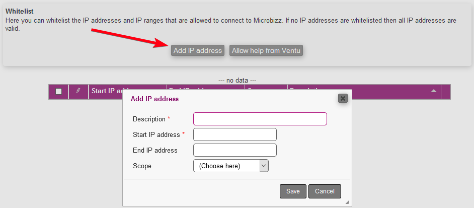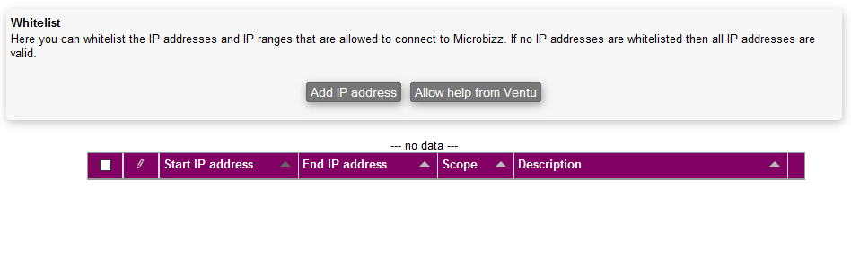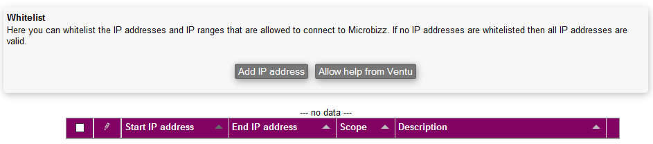 In this section, it is possible to whitelist IP addresses that are allowed to connect to your Microbizz solution. If nothing is whitelisted, then any IP address can connect.