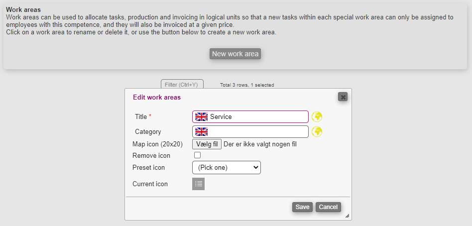 A work area in Microbizz is an element used to quality what work is done. For a task it adresses what kind of task this is, and for an hour registration it designates what kind of work we performed.