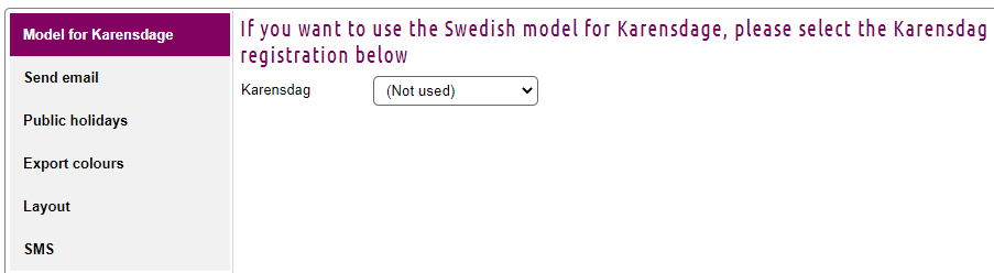 Karensdag: When used, this enables the use of the Swedish model for Karensdage.