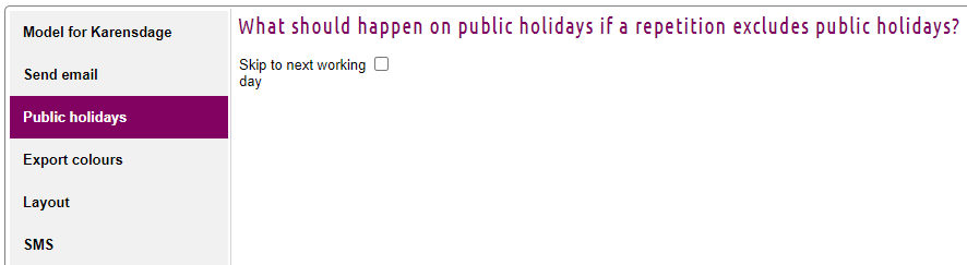 Skip to next working day: When ticked, the system skips to next working day if a repetition excludes public holidays on a public holiday.