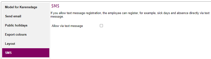 Allow via text message: If checked,an employee can, for example register their sick days and absence via text messages. You need to have an SMS gateway associated with your solution to use this feature. If this is desired, contact Ventu