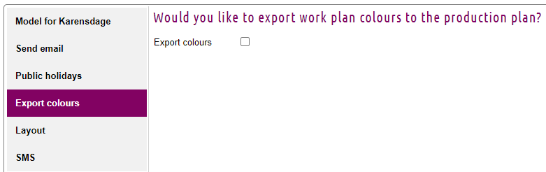 Export colours: When ticked, the work plan colours are exported to the production plan.