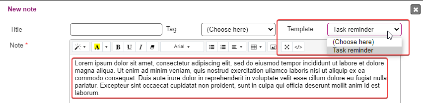 You may pre-fill the note from a template; templates are created in SYSTEM > NOTES > TEMPLATES.
