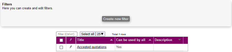 In the sales module filters are commonly used to find specific quotations that match the filter criteria.