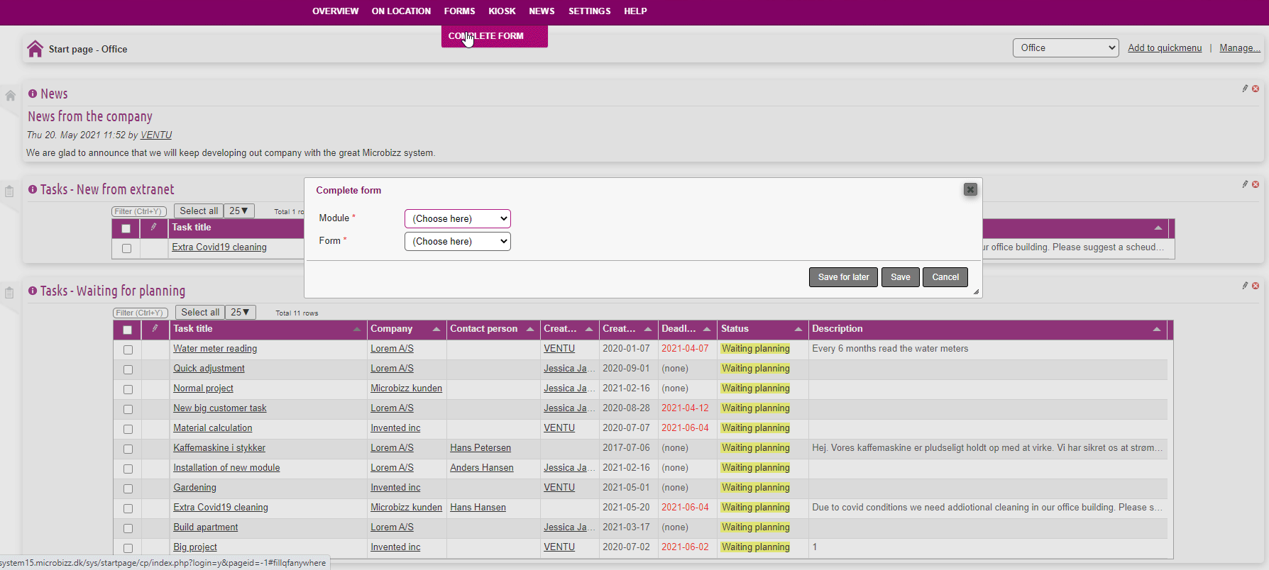 This function allows you to quickly complete a form from the startpage.
