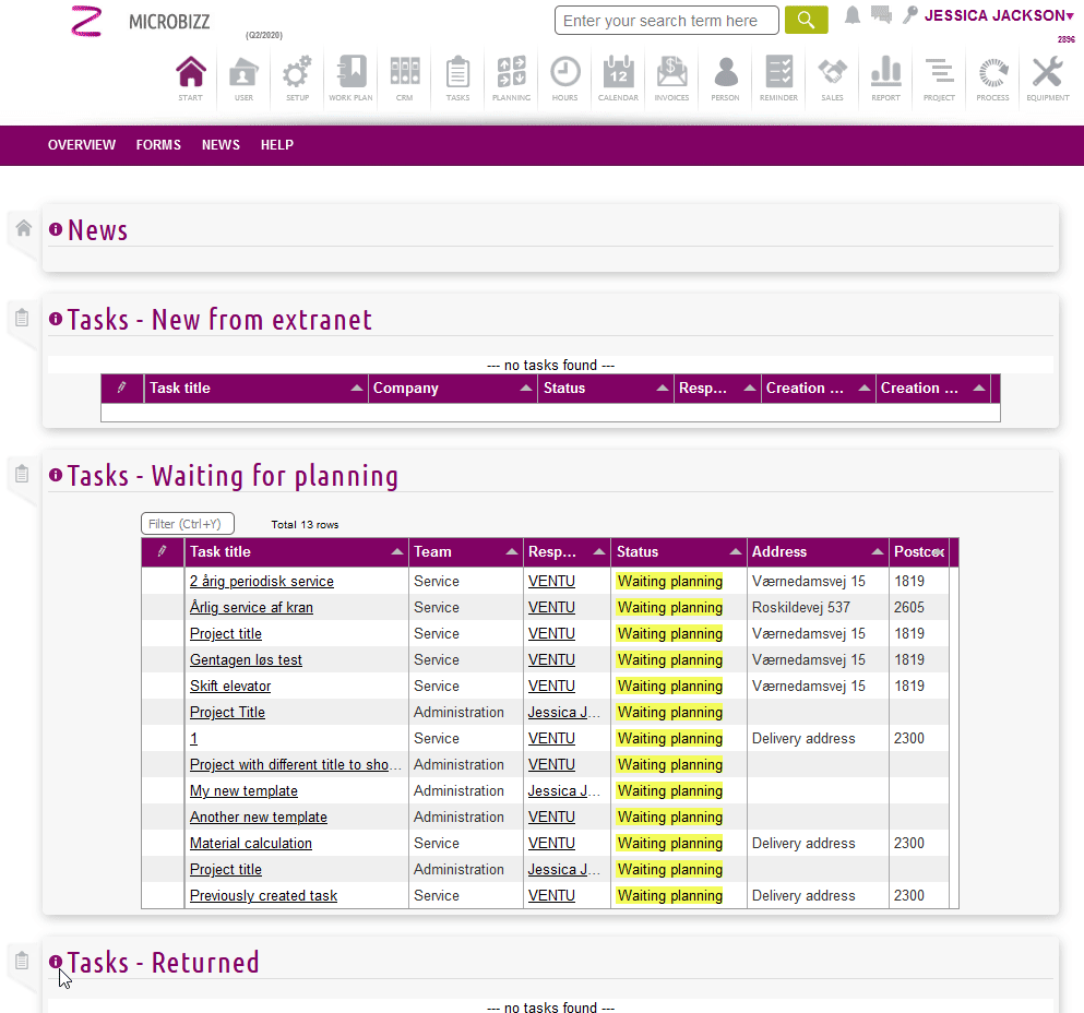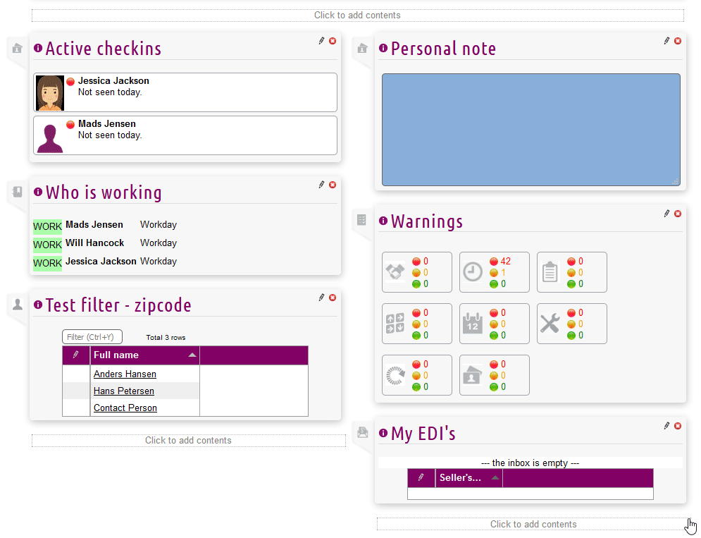 Start page info boxes are content related boxes that are displayed on the Start page. Info boxes can basically be anything and roughly just refers to boxes on the Microbizz Start page. This can be anything from Microreports, Workplan resumé, Active check ins etc.