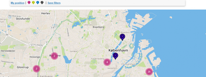 The "My position" button moves the map to where you are right now, assuming the browser can read your current location. The 4 coloured markers allow you to filter which companies/tasks/users/persons to display on the map.