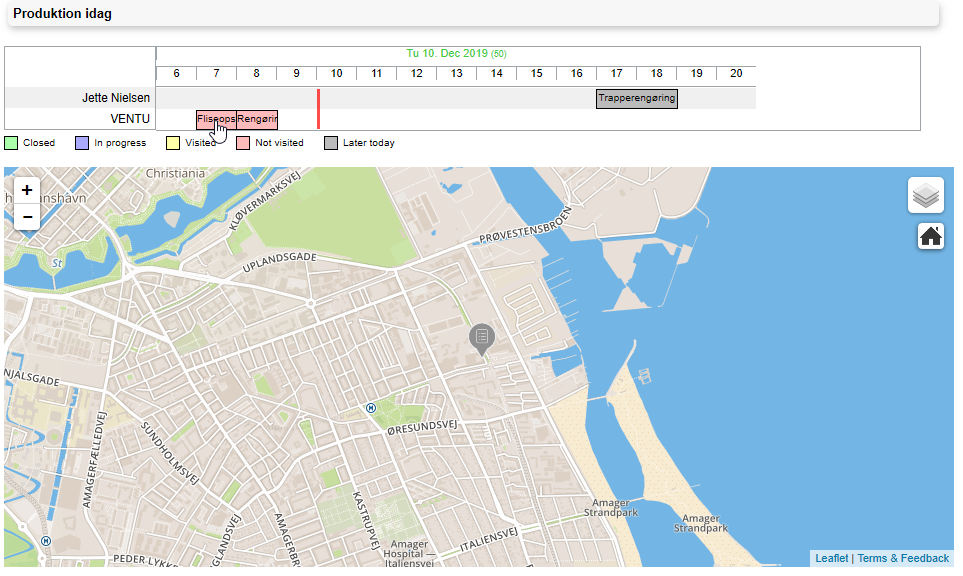 Displayed in different colors it´s possible to see if tasks are: Closed, in progress (currently checked in on), visited (i.e. checked in on and out of), not visited or are planned later the same day.
