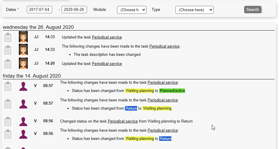 The activity is shown in a chronological order and the information contain: