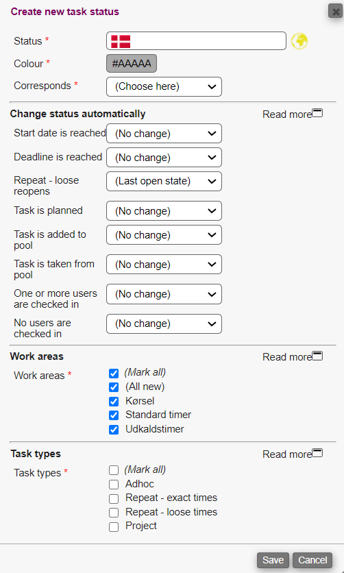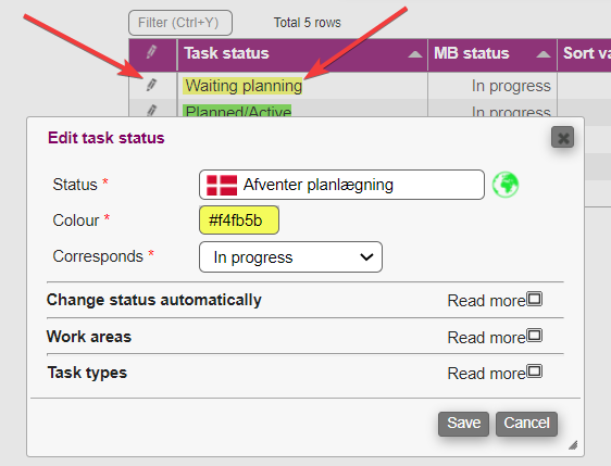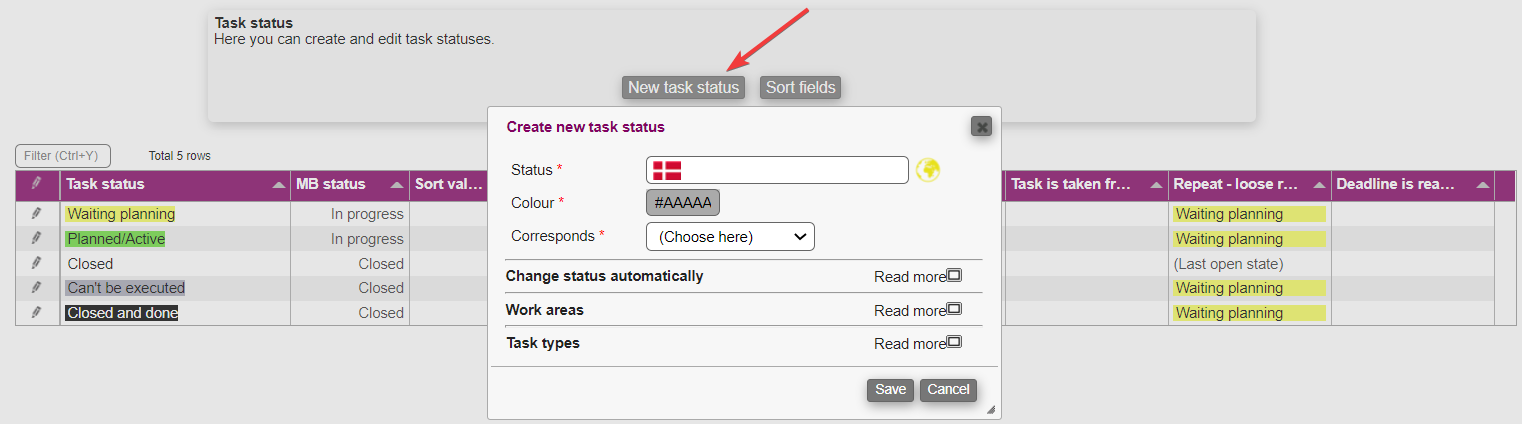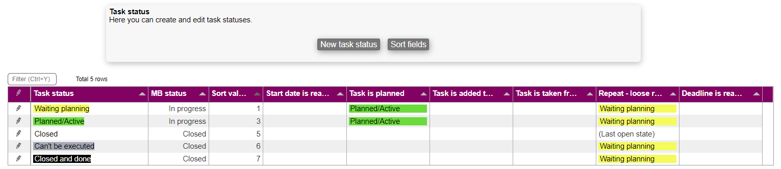Be aware that it's not possible to edit the fields below, if atleast 1 task is using the status