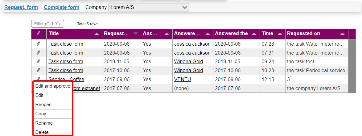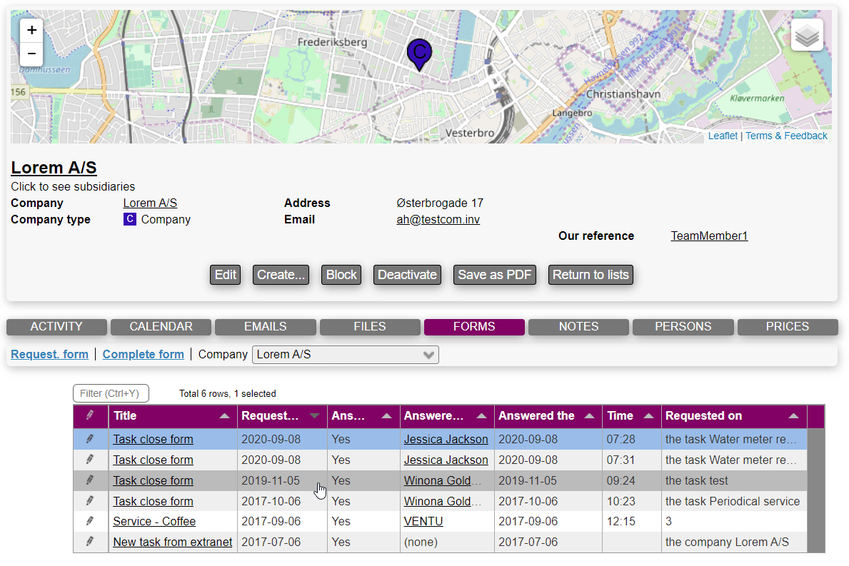 Notice that forms filled out on a task (or equipment etc.) will be listed amongst the form answers for the task's company; however this doesn't apply to forms that were requested on the task (or equipment).