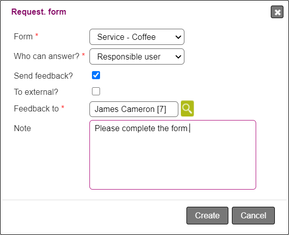 To external?:This option will let you send the form to a person rather than a user. The feedback to field will only be able to search for persons. By pressing Create, the form will be send through a mail