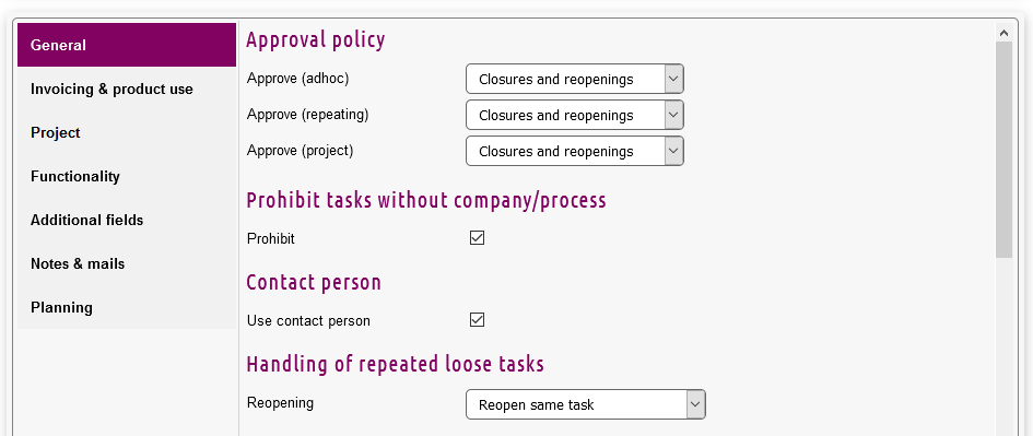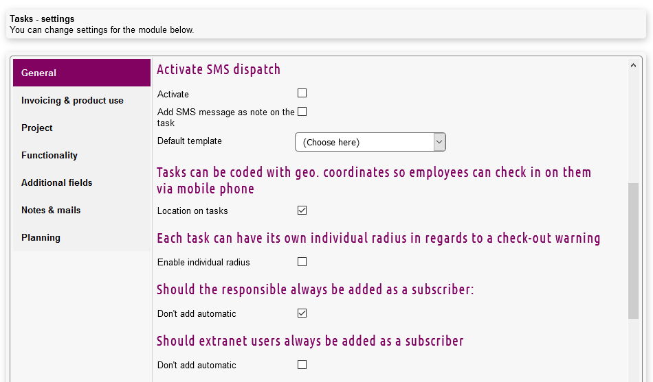 Use contact person: If checked, every task has a contact person (from the Person module); if not checked the task will simply have fields for entering the name and phone of a person.