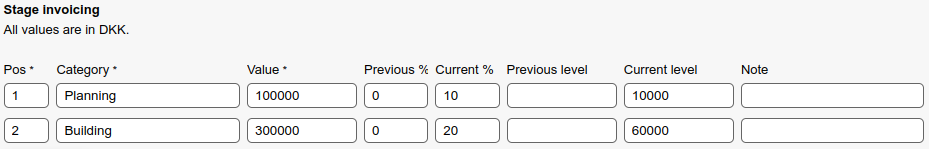 If a task uses stage invoicing a new tab named "Stage invoicing" will appear on the task details page. Here you can add any number of lines, each line will have a value and a percentage.