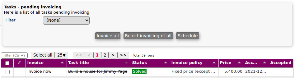 The Invoice all and Reject invoicing of all buttons change if you select any of the listed tasks.