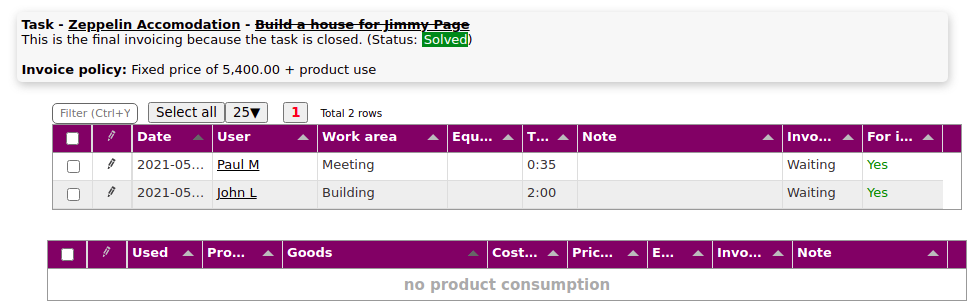 Here you can see details about the invoicing of the task: the invoice policy, the pending product use etc.