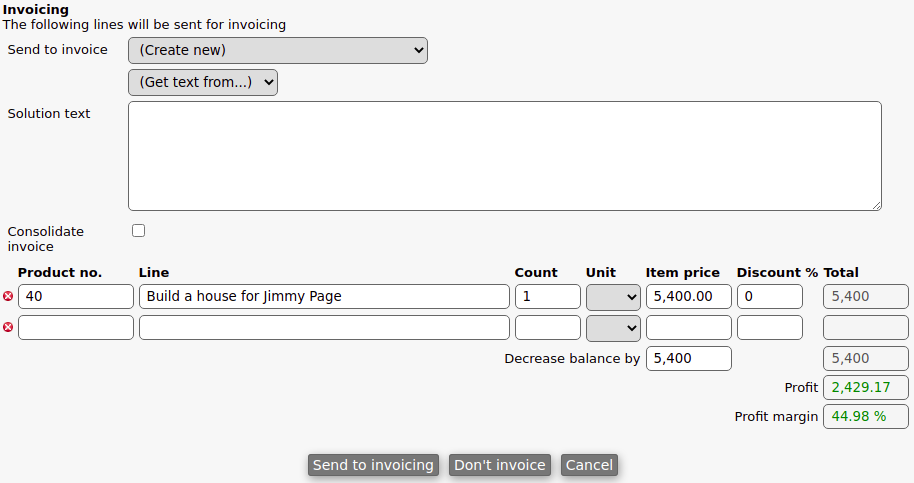 Below you may edit the details of the invoice lines, and you may add or remove invoice lines. You may select if the lines should be added to a new invoice or to an existing invoice.