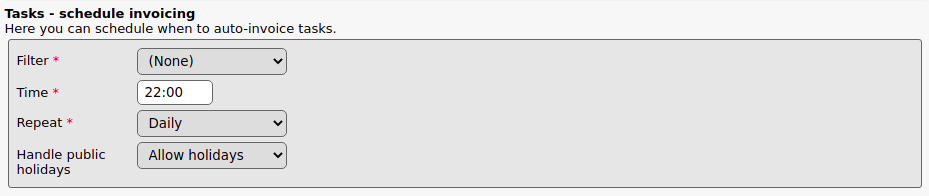 You can schedule when to auto-invoice tasks. This is equivalent to clicking on the Invoice all button, except it only invoices those that match a filter.