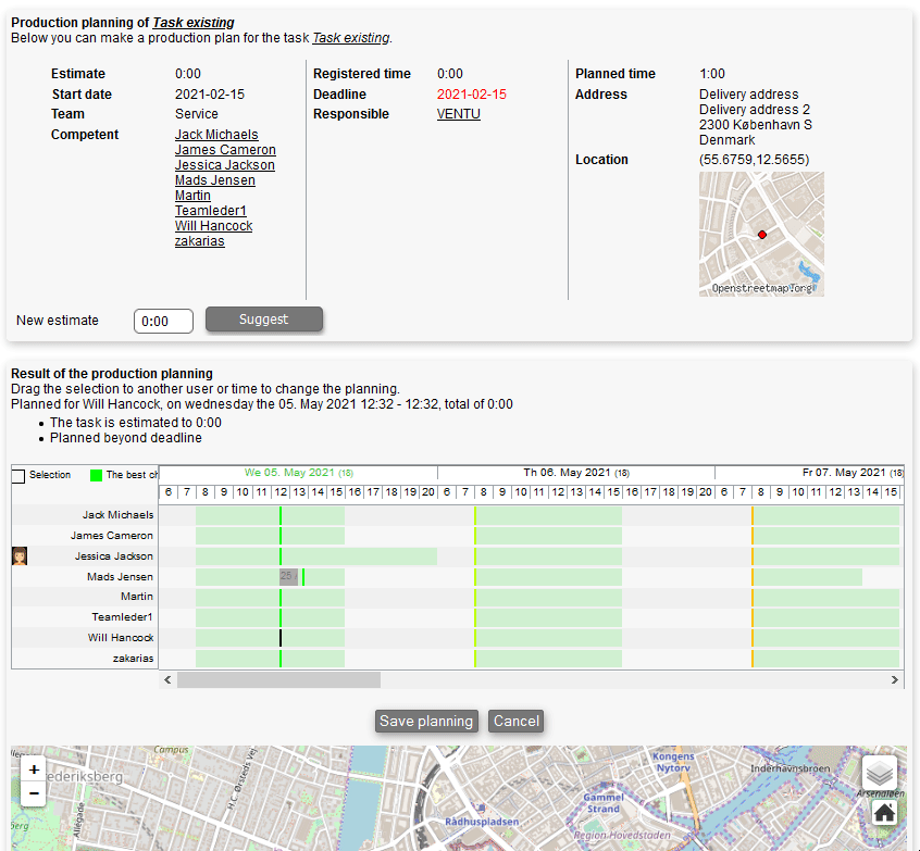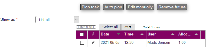 It is possible to auto plan the task. This will look at all the relevant users and try to find one who is available and who might live close by etc. The exact rules for determining which user is most suitable is beyond the scope of this documentation.