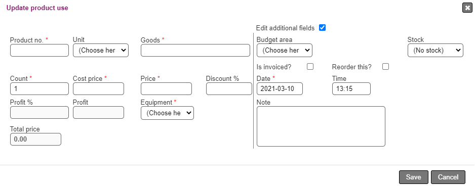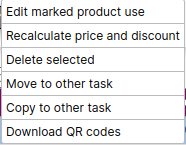 Here you may edited the marked product uses, f.ex. you may change the date or status for all product uses in one go.