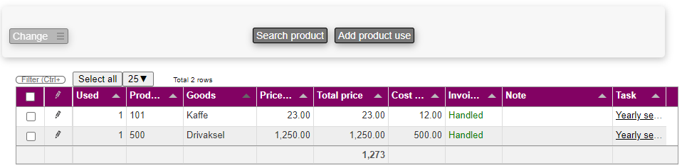 The product use tab is used in most modules and shows a list of products used on the specific object, if any.