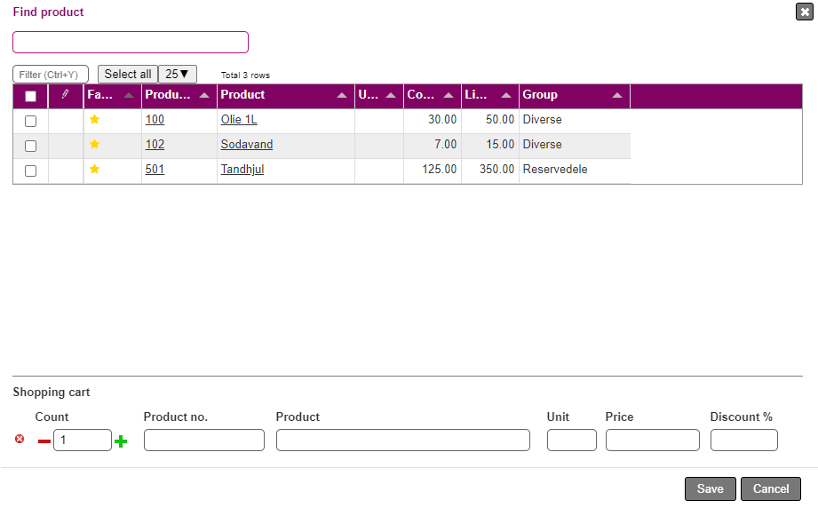 Notice that an empty search query will list the favourite products and the commonly used products.