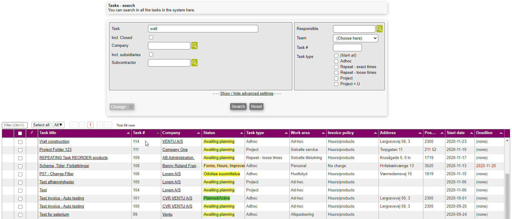 Depending on your permissions and policies you'll be able to search for the different tasks by using the global search bar. You can for instance search for task names and the company they might be attached to.