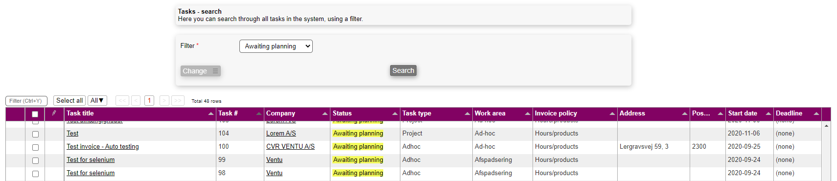 You'll also be able to base your search on the tasks filter in the menuSearch with filter. A list of yourfilters will be shown, which you can base your search on. Simply choose the filter you need from the dropdown and then search.
