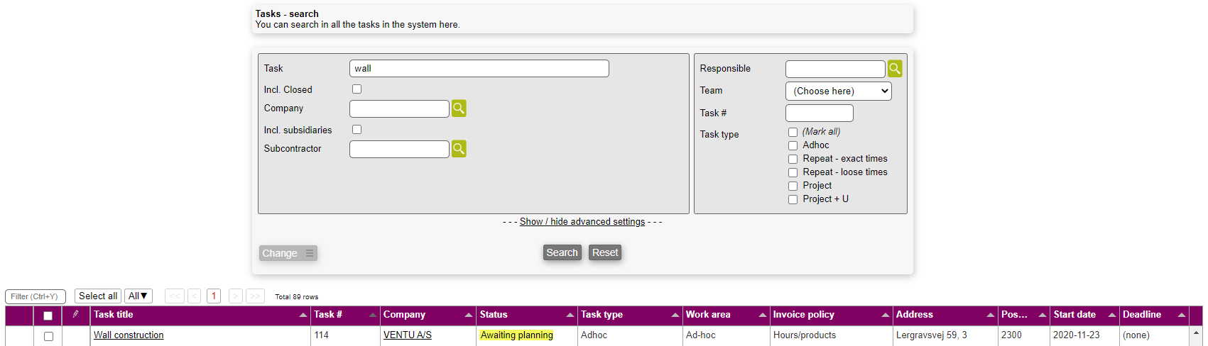The Task search function can be found in the submenu Task >Search, within the Tasks-module.