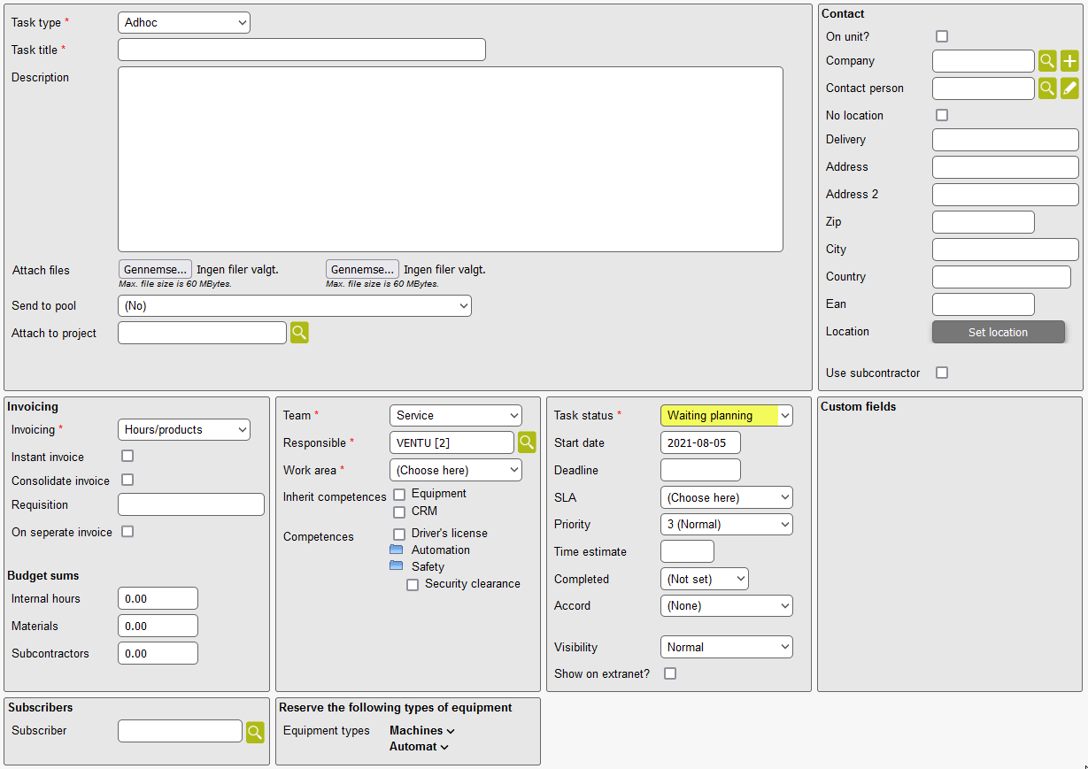 The email contains various information, among other things, different fields, item consumption, and different help texts on how to send invoices. All files that belong to the task (from the FILES tab) and are marked as "Show on extranet" will be included with the email; this is regardless of whether or not they are stored in a folder that is shown on the extranet.