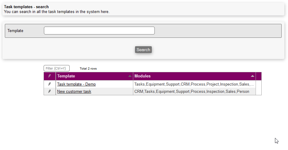 Template access is accessed by the menu TASK/TASK TEMPLATES/SEARCH and then use the pencil menu and then access on the template you want to manage.